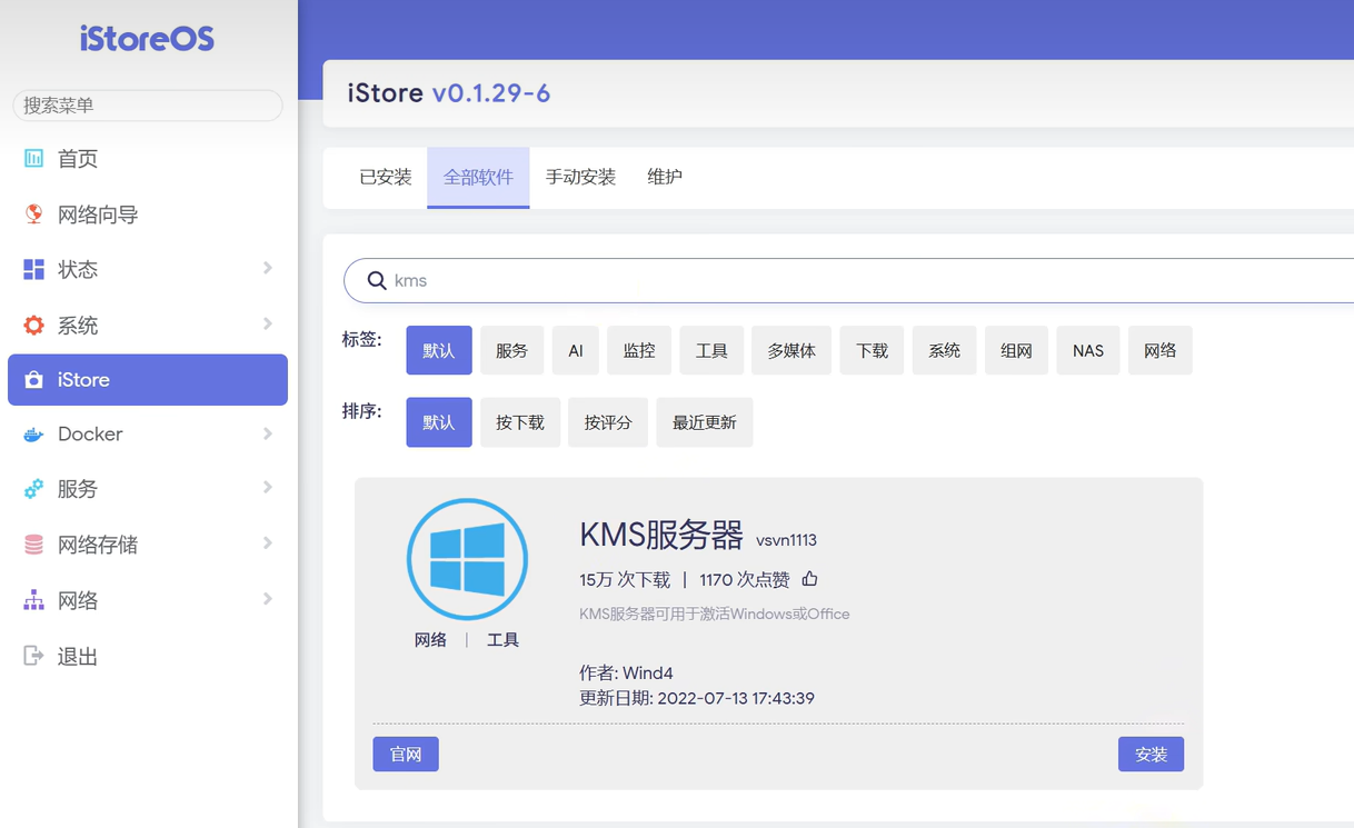 在iStoreOS软件仓库或NAS上的软件商店里找到KMS并安装