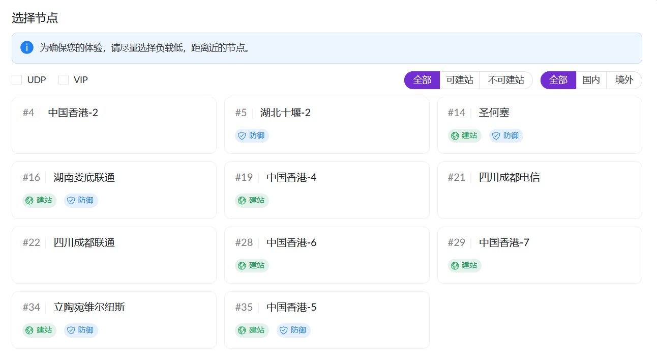- 选择节点,免费用户可选很少,不适合建站