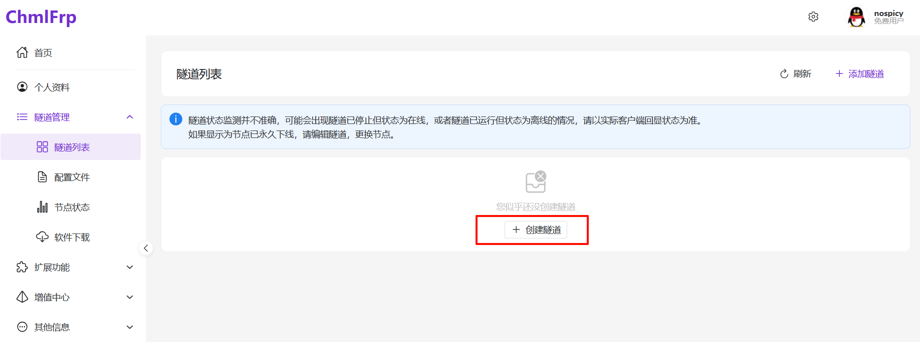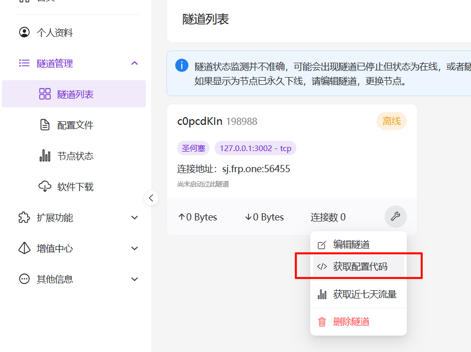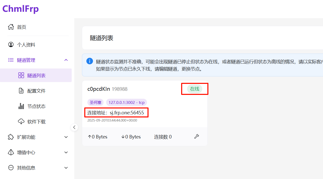 - 提交后返回chmlfrp网站,隧道状态已改为