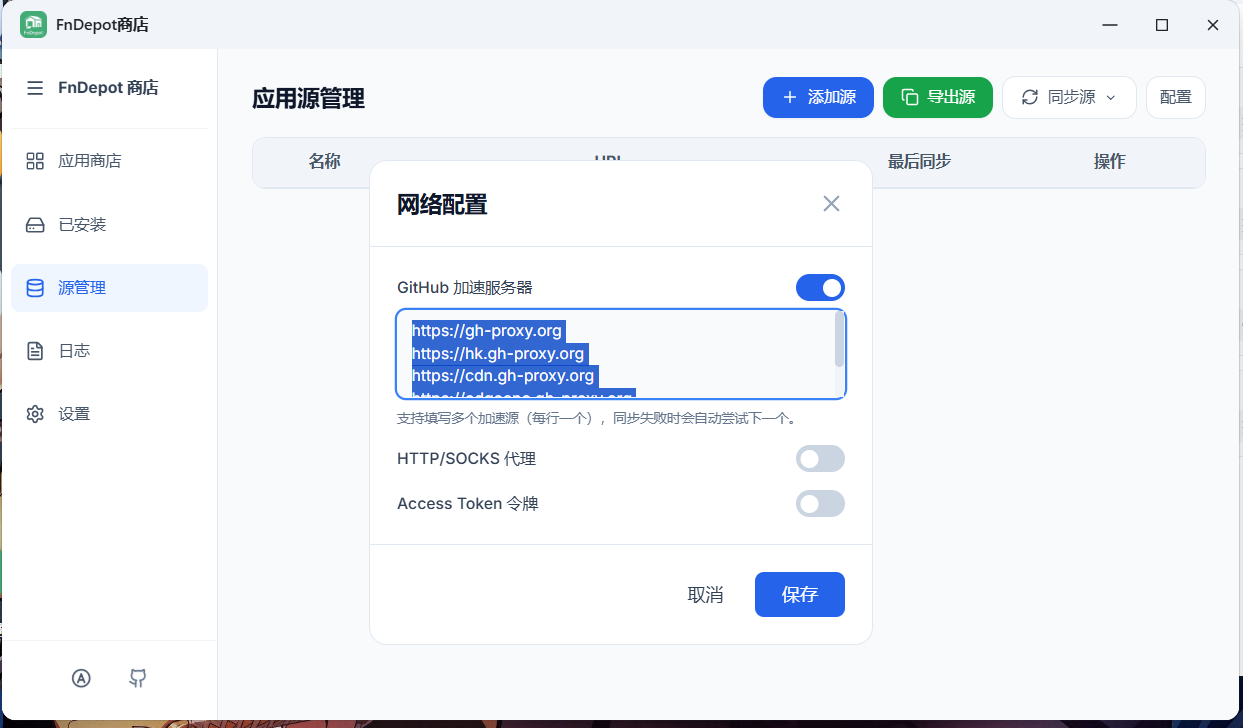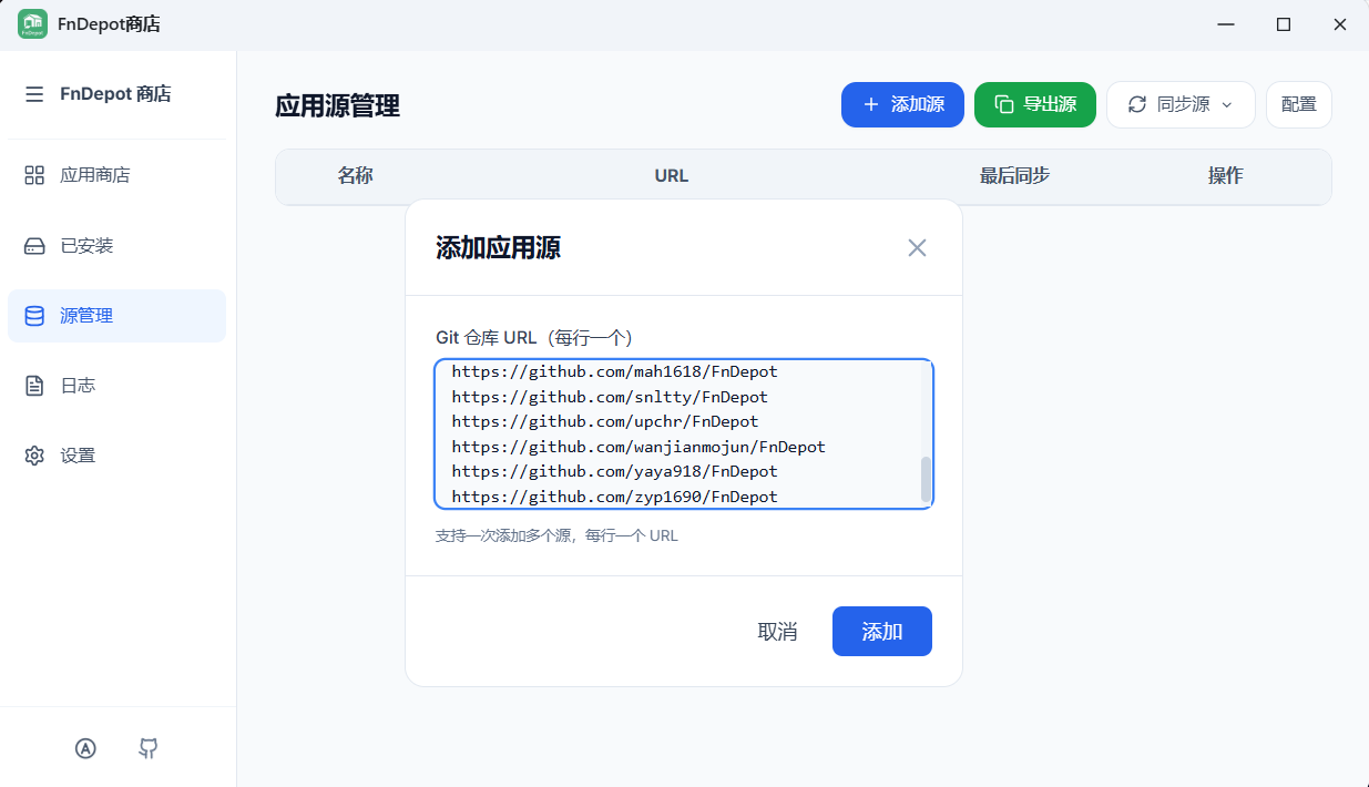源管理- 点击添加源- 将仓库源地址粘贴进去https://github.com/yuexps/FnDepot https://github.com/IMGZCQ/FnDepot https://github.com/EWEDLCM/FnDepot https://github.com/hbestm/FnDepot https://github.com/Hxido-RXM/FnDepot https://github.com/710850609/FnDepot https://github.com/jianzhichu/FnDepot https://github.com/RROrg/fn-apps https://github.com/ctllo-bit/FnDepot https://github.com/htnanako/FnDepot https://github.com/KKKK987/FnDepot https://github.com/mac1256/FnDepot https://github.com/mah1618/FnDepot https://github.com/snltty/FnDepot https://github.com/upchr/FnDepot https://github.com/wanjianmojun/FnDepot https://github.com/yaya918/FnDepot https://github.com/zyp1690/FnDepot添加完成后,系统会自动开始同步仓库内容。