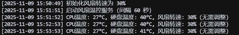 log "CPU温度: ${cpu_temp:-未知}°C, 硬盘温度: ${hdd_temp:-未知}°C, 风扇转速: $current_speed% (无需调整)"